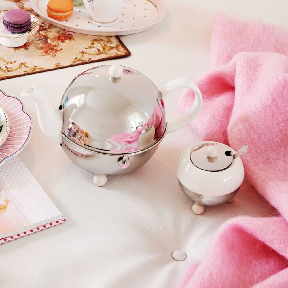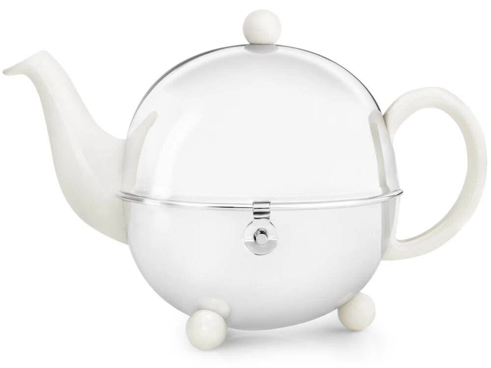 De Bredemeijer Cosy theepot is vervaardigd uit wit aardewerk en voorzien van een roestvrijstalen mantel. De pot heeft een inhoud van 1,3 liter. De mantel is glanzend van kleur en houdt de thee in de pot lang warm. Gebruik de pot voor het schenken en serveren van thee.