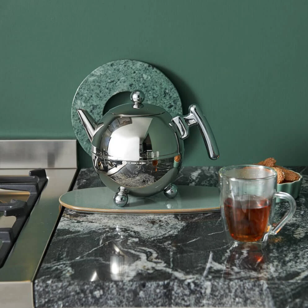 De Bredemeijer Duet Bella theepot is vervaardigd uit glanzend roestvrij staal. De theepot is dubbelwandig waardoor de inhoud langer op temperatuur blijft. De Bredemeijer theepot heeft een inhoud van 1,5 liter en is voorzien van verchroomde kunststof grepen. Gebruik de theepot voor het maken en uitschenken van thee.