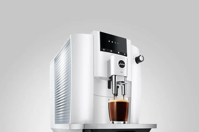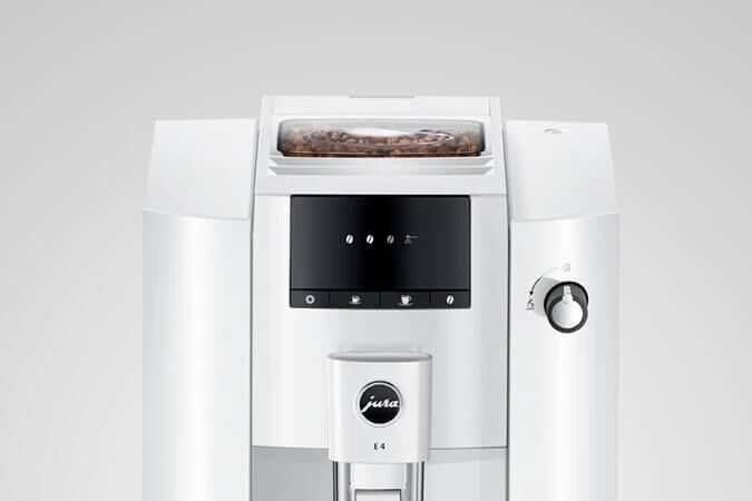 Met de JURA E4 zet u verschillende koffiespecialiteiten, zoals caffé lungo en espresso. De E4 is een zeer compacte volautomatische espressomachine die met 1 druk op de knop thee of vier koffiespecialiteiten kan bereiden uit hele of gemalen koffiebonen. De machine wordt heel eenvoudig aangestuurd vanaf het symbooldisplay aan de voorzijde.